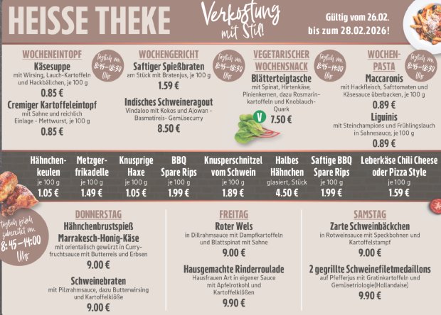 Neben unseren selbst hergestellten Frischeprodukten bieten wir Ihnen täglich ein wechselndes Mittagsmenü an unserer heißen Theke – perfekt für Ihre Mittagspause oder den schnellen Genuss zwischendurch.