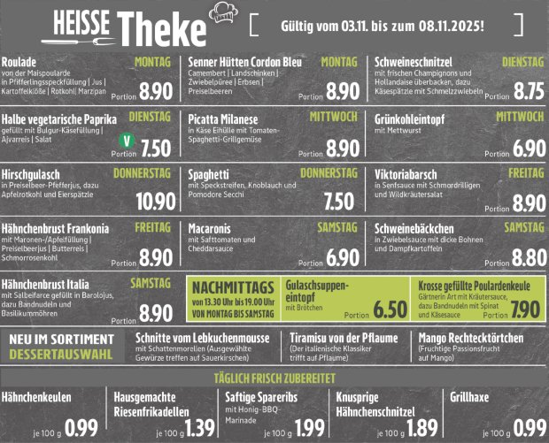 Angebote Die Angebote der Woche sind gültig vom 03.11. bis zum 08.11.2025. Bild zum Vergrößern anklicken oder hier herunterladen PDF-Download Bild zum Vergrößern anklicken oder hier herunterladen PDF-Download Produktkategorien Alle Angebote KNÜLLER Fleisch & Wurst Molkerei & Käse Obst & Gemüse Getränke Drogerie Fisch & Meeresfrüchte Grundnahrung Knabbern & Naschen Tiefkühl Non-Food Sonstiges Haus & Heim Bekleidung Tiernahrung