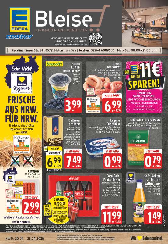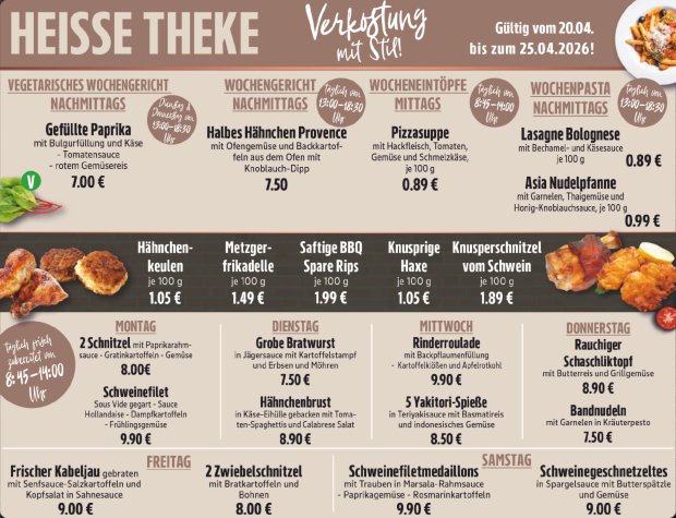 Angebote Die Angebote der Woche sind gültig vom 20.04. bis zum 25.04.2026. Bild zum Vergrößern anklicken oder hier herunterladen PDF-Download Bild zum Vergrößern anklicken oder hier herunterladen PDF-Download Produktkategorien Alle Angebote KNÜLLER Fleisch & Wurst Molkerei & Käse Obst & Gemüse Getränke Drogerie Grundnahrung Knabbern & Naschen Tiefkühl Non-Food Sonstiges Haus & Heim Bekleidung Tiernahrung